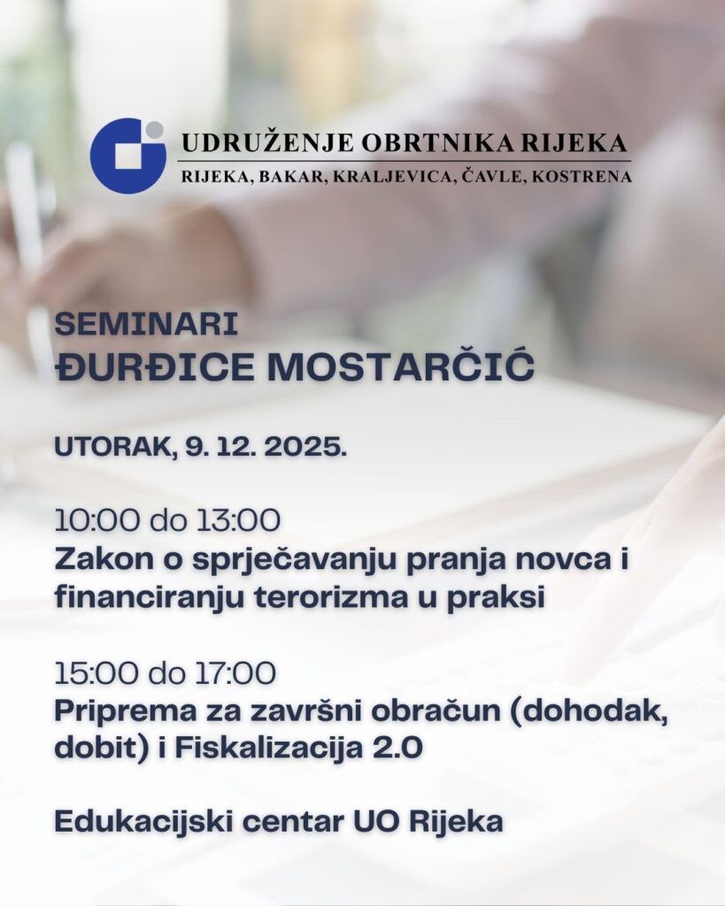 Udruženje obrtnika Rijeka poziva sve članove Udruženja obrtnika Rijeka 9.12.2025. na besplatne seminare: