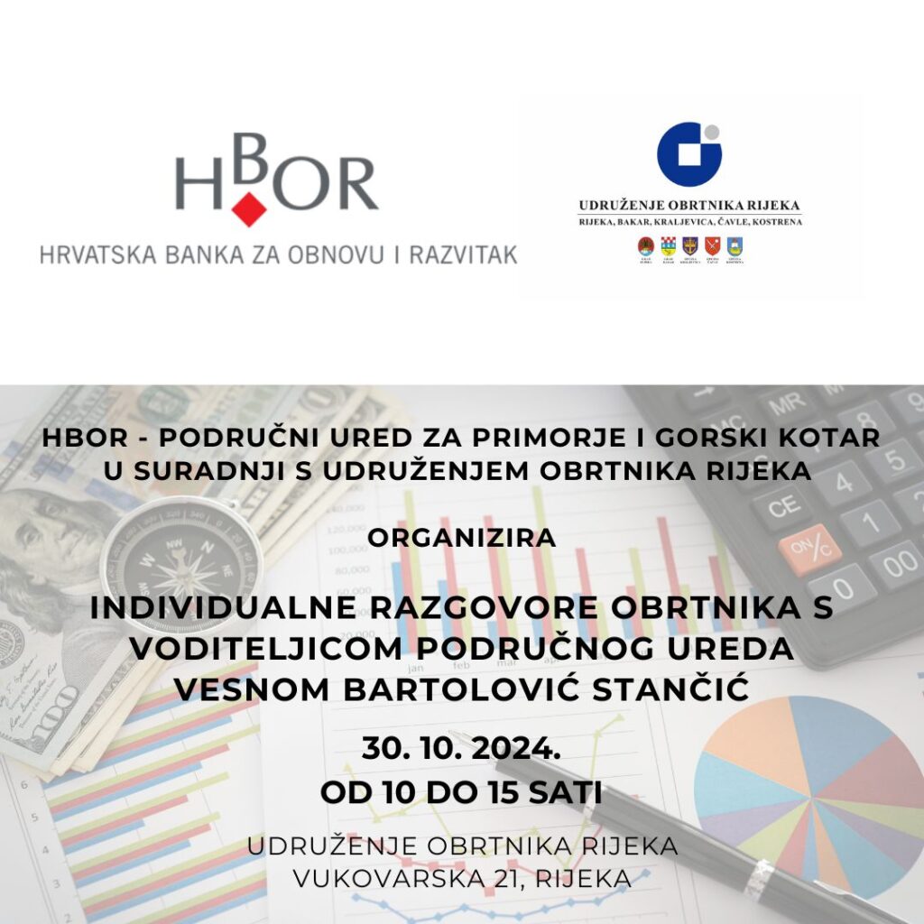 HBOR Područni ured za Primorje i Gorski kotar u suradnji sa Udruženjem obrtnika Rijeka organizira individualne razgovore obrtnika s područja djelovanja Udruženja obrtnika –  Rijeka, Čavle, Kostrena, Kraljevica i Bakar s voditeljicom Područnog ureda, Vesnom Bartolović Stančić koji će se održati u prostorijama Udruženja obrtnika u Rijeci, Vukovarska 21, u srijedu, 30.10.2024.godine u vremenu od 10:00 do 15:00 sati.